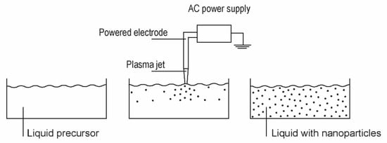 A similar device was also used by Murali and Sohn [36] except that they used zinc nitrate powder of typical dimension 50 µm as the precursor. The discharge power was 15 kW and the Ar the carrier gas. As in the case of Ko et al. [35], the rather large powder melted and evaporated while passing the discharge zone, and the vapours condensed in the postglow region to form almost perfectly spherical nanoparticles on various diameters between about 10 and 50 nm. The formation of the nanoparticles followed the scheme presented in Figure 3. A more thorough explanation of the method is presented in the recent paper [46] of the same authors. An earlier review on the plasma arc synthesis of various nanoparticles using the configuration in Figure 5a was published by Seo and Hong [47].