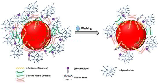 PC1 separated the samples mostly based on the contributions deriving from polysaccharides, lipids, and lipid peroxidation, being the latter, most represented within Micrococcus sp. cells exposed for 72 h to SeO32− (Figure 5a), due to the oxidative damage exerted by this oxyanion. Similarly, bacterial cells grown for 120 h in the absence or presence of SeO32−, those exposed for 24 h to the oxyanion, and Bio SeNP extract displayed significant lipids and lipid peroxidation IR vibrational modes (Figure 5) attributable to the supplying of either glucose or glucose and SeO32− as a stress source. The amide II bands were fundamental for PC2, highlighting the diversity of Micrococcus sp. cells incubated for 24 h with the oxyanion (Figure 5), which was the sample featuring the largest and most convoluted signal for this vibrational mode (Figure S3 and Table S6). This result indicated the occurrence of important protein modifications from the beginning of bacterial growth when SeO32− was added. In the case of PC3, most of the variability was attributed to the modified amide II and polysaccharide IR peaks (Figure 5b). The latter contribution resulted discriminant for ATR-FTIR spectra of Se-containing samples (localized in the positive quadrants) and those referring to Micrococcus sp. SeO32−-free culture (negative quadrants) (Figure 5a), reflecting the higher growth extent observed when the oxyanion was absent (Figure S2a). Indeed, the largest polysaccharide bands were detected for unchallenged cells grown for 24 and 72 h (Figure 5a), which showed a higher biomass yield than other cell samples (Figure S2a). Only one cluster was observed performing PCA, which grouped Micrococcus sp. cells exposed for 120 h to SeO32− and the Bio SeNP extract (Figure 5a), whose similarity derived from SeNP extraction itself, which was carried out after 120 h of bacterial growth. The OM was relatively close to the Bio SeNP extract (Figure 5a), as the former was directly recovered from the biogenic extract. Finally, a shared feature of all identified PCs was the strong distance detected for the Bio SeNP extract_w (Figure 6), which related to the loss of polysaccharides, lipids, and, in a smaller portion, proteins, due to the washing procedure. A graphic representation displaying the complexity of the Bio SeNP extract and the adsorption of biomolecules, within the OM, onto the SeNP surface is proposed in Figure 6.