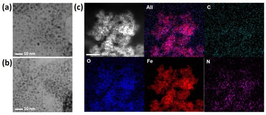 TEM analysis of (a) His@MNPs and (b) MNPs. (c) EDS analysis with the TEM images of His@MNPs.