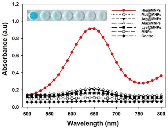 The peroxidase-mimicking activity of His@MNPs was demonstrated via the oxidation of TMB in the presence of H2O2. Generally, 100 µg/mL of His@MNPs was added into sodium acetate buffer (0.1 M, pH 4.0) containing 100 mM H2O2 and 5 mM TMB, followed by 10 min incubation at 40 °C. After the reaction, the color change from colorless to blue of oxidized TMB can be observed by the naked eye, and data were recorded in scanning mode by employing a microplate reader (Synergy H1, BioTek, Winooski, VT, USA). The oxidation of controls, including pristine MNPs as well as other amino acids coated MNPs (Met@MNPs, Arg@MNPs, Ala@MNPs and Lys@MNPs), were also carried out and recorded for comparisons.