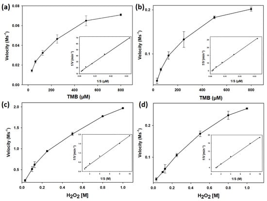 Steady-state kinetic assays of (a) His@MNPs and (b) pristine MNPs with TMB as substrate and their corresponding double reciprocal (Lineweaver-Burk) plots of activity. H2O2 substrate was used in the steady-state kinetic assays performed by (c) His@MNPs and (d) pristine MNPs.