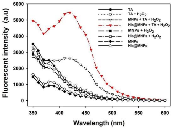 In general, the peroxidase-mimicking activity is demonstrated by confirming the generation of free hydroxyl (·OH) radicals from H2O2 [,]. To test this, a non-fluorescent TA probe was deployed to examine the formation of free OH radicals, which are produced during the decomposition of H2O2. Upon the formation of OH, the non-fluorescent TA molecules transform into highly fluorescent products (2-hydroxy terephthalic acid), which emit a unique fluorescence signal at around 435 nm. It is worth mentioning that, compared to bare MNPs, the amount of free OH radicals generated from His@MNPs was considerably increased as demonstrated in Figure 4, indicating their higher catalytic activity.