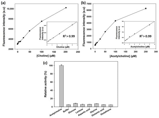 Fluorescent detection of H2O2, choline, and ACh was conducted by utilizing AUR as a substrate in a black 96-well plate, and the data were recorded by using a microplate reader. For the detection of choline and ACh, Tris-acetate buffer at pH 7.0 was utilized due to the pH-dependent nature of ChOx and AChE, which show their activities at around neutral pH [,]. Regarding H2O2 detection, a total 200 µL solution consisting of 100 µg/mL His@MNPs, 10 µM AUR, and H2O2 at various concentrations (0–250 mM) was incubated at 40 °C for 15 min. The resulting fluorescence signals of oxidized AUR were recorded by a microplate reader with the excitation and emission wavelength at 490 nm and 590 nm, respectively. In terms of choline determination, the experiment was conducted via the following procedure. A total 200 µL of mixture reaction containing His@MNP (100 µg/mL), ChOx (0.6 U/mL), AUR (10 µM), and different concentrations of choline (0–200 µM) in Tris-acetate buffer (10 mM, pH 7.0) was incubated at 40 °C for 15 min. The measurement was performed by following the same aforementioned procedures for detection of H2O2. ACh detection by His@MNPs was carried out by incubating His@MNP (100 µg/mL), AChE (5 U/mL), ChOx (0.6 U/mL), AUR (10 µM), and ACh with different concentrations (0–250 µM) in the Tris-acetate buffer for 15 min at 40 °C. The signal results were recorded by the same procedure described above.