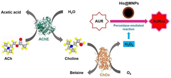 According to the above chain reactions, it can be observed that in the occurrence of ACh, enzyme AChE catalyzes its hydrolysis to generate choline, which is the specific substrate for choline oxidase. After choline molecules were cleaved by ChOx, H2O2 molecules were formed and subsequently consumed by the peroxidase-mediated reaction catalyzed by His@MNPs. This reaction produces free ·OH radicals that interact with AUR to create oxidized AUR. Based on previous reports, the concentration of ACh in body fluid is extremely low, generally in the nanomolar range [,]. Thus, AUR was exploited instead of other peroxidase substrates to monitor the presence of ACh since it can produce a very sensitive, highly fluorescent product (AURox). By recruiting AUR as a peroxidase substrate, the enzymatic reaction catalyzed by His@MNPs was performed at neutral pH (pH 7.0).