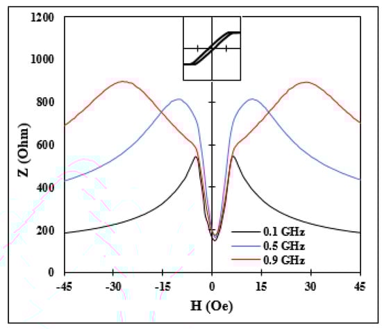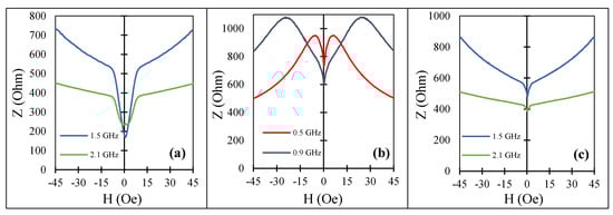 After optimal current annealing, sample No2 had an induced circumferential anisotropy and positive magnetostriction. The impedance spectra are shown in Figure 10. The sensitive low-field region appeared and the maximal sensitivity at 1 GHz was about 50%/Oe and about 15%/Oe for a frequency of 1.5 GHz. These values were smaller than for sample No1 in as-prepared state since the induced anisotropy was of a helical type and its value was slightly lower. However, the combination of circumferential (or helical anisotropy) and positive magnetostriction was of interest to realize large impedance change at zero field [,], as is discussed in the next section.
