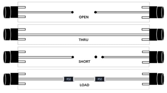 Schematic of specially designed PCB calibration cells with the SOLT standards. THRU standard utilizes direct connection (“flush THRU”) with ; SHORT is realized via connecting the signal strip to the ground; LOAD utilizes two 50 Ω RF Vishay resistors connected to the ground in parallel.