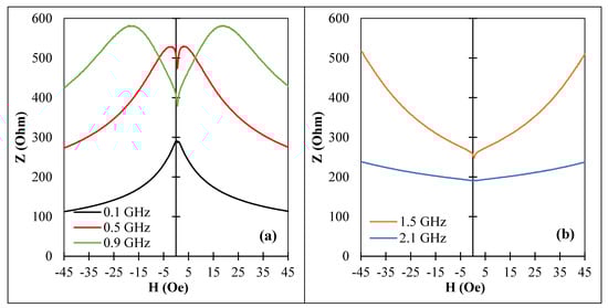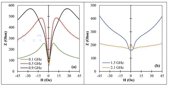 MI vs. magnetic field for amorphous Co71Fe5B11Si10Cr3 microwires (sample No2) after current annealing with for 30 min at GHz frequency range: (a) 0.1 GHz to 0.9 GHz and (b) 1.5 GHz to 2.1 GHz. corresponds to the impedance amplitude.