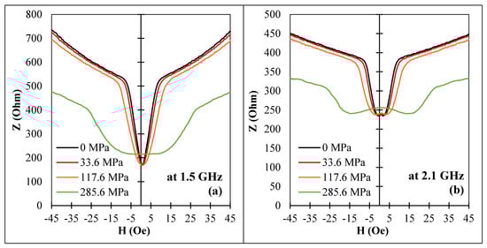 Effect of a tensile stress on the MI vs. magnetic field plots for amorphous Co66.6Fe4.28B11.51Si14.48Ni1.44Mo1.69 microwires (sample No1) in as-cast state at frequencies: (a) 1.5 GHz and (b) 2.1 GHz. corresponds to the impedance amplitude.