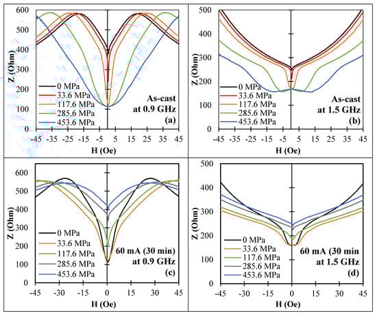 Effect of a tensile stress on MI vs. magnetic field for amorphous Co71Fe5B11Si10Cr3 microwires (sample No2) in as-cast state in (a,b) and after current annealing (60 mA, 30 min) in (c,d) for different frequencies: (a,c) −0.9 GHz; (b,d) −1.5 GHz. corresponds to the impedance amplitude.