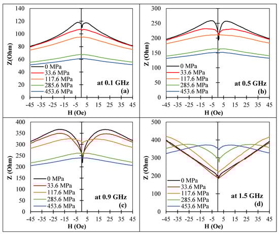 Effect of a tensile stress on the MI vs. magnetic field behavior for amorphous Co71Fe5B11Si10Cr3 microwires (sample No3) in as-prepared state at frequencies: (a) 0.1 GHz, (b) 0.5 GHz, (c) 0.9 GHz, and (d) 1.5 GHz. corresponds to the impedance amplitude.