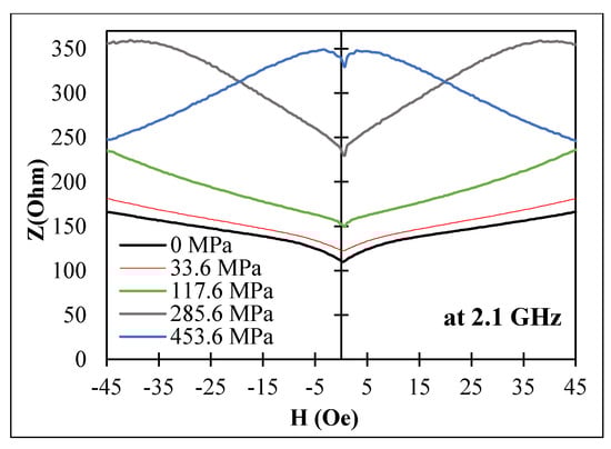 Axial magnetoelastic anisotropy for sample No3 was increased by increasing the annealing current, as follows from the impedance behavior at low frequencies (<100 MHz): the impedance value at zero field decreased with increasing . This could have been due to increase in the magnetostriction constant by annealing. For , a monotonic increase in the impedance (at zero field) was observed up to frequencies of few GHz when a tensile stress was applied, as shown in Figure 15.