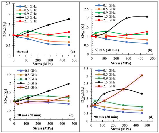 The strongest change in impedance caused by the application of tensile stress was observed for current annealed wire, which had a combination of induced circular anisotropy and positive magnetostriction. A large stress-MI effect preserved up to 1 GHz, as shown in Figure 13. For a range of 300 MPa, the impedance increased almost four times at a frequency of 0.5 GHz, and it still increased by 60% at a frequency of 1.5 GHz.