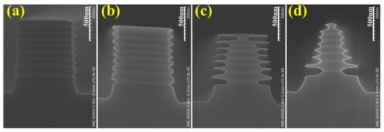 - Caubet, V.; Beylier, C.; Borel, S.; Renault, O. Mechanisms of isotropic and selective etching between SiGe and Si. J. Vac. Sci. Technol. B Microelectron. Nanometer Struct. 2006, 24, 2748. [Google Scholar] [CrossRef]