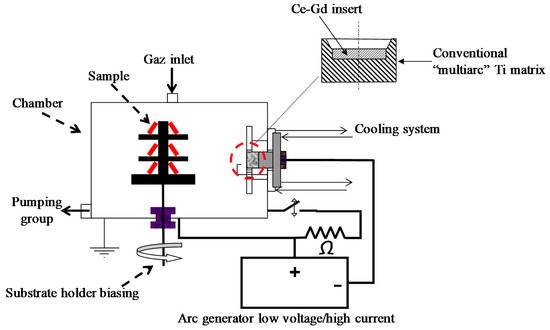 Ce–Gd–O films were deposited on stainless steel (AISI430) substrates by cathodic arc evaporation under reactive argon–oxygen gas mixtures of a composite target constituted of a 50 mm diameter Ce–Gd (90–10 at.%) metallic disc inserted into a conventional multiarc Ti evaporation target (Figure 1). The reactor is a 100 L stainless steel cylinder pumped down via a secondary oil diffusion vacuum system, allowing a base vacuum of about 10−4 Pa before refilling with argon (20 sccm) and oxygen (30 to 50 sccm). The arc discharge characteristics were 60 A and about −30 V, yielding a total pressure during the run in the range of 0.4–0.6 Pa, depending on the inlet oxygen flow rate. The AISI 430 stainless steel substrates (20 × 20 mm2) were placed next to the target at a draw distance of 180 mm. Prior to the deposition phase, they were polished with diamond paste (3 µm), degreased under ultra-sound in a hot dichloromethane bath, rinsed with alcohol, and dried in hot air. An in situ ion cleaning of their surface was realized in pure argon for 1 min by biasing them (VS = −1000 V) in the presence of the arc discharge and then, by biasing them at −400 V during the first five minutes of the deposition stage. The following of the run was realized with a substrate bias of −50 V after oxygen introduction at the desired flow rate.