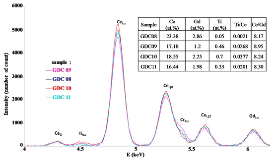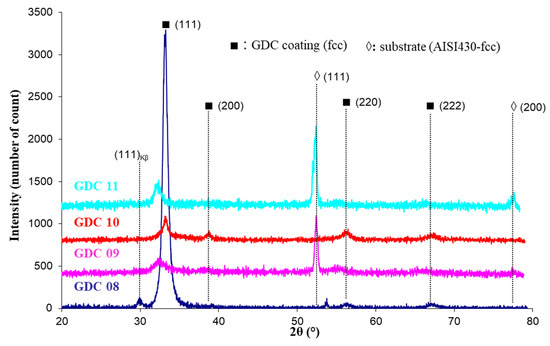 The main deposition conditions used in this study are summarized in Table 1. Although the EDS technique does not allow for good precision of the oxygen content in the coatings, it gives a convenient estimation of the metal composition and then of the Ce/Gd ratio. Figure 2 represents the interesting range of EDS measurements for the Ti, Ce, and Gd emissions lines. With the precision of the EDS technique on oxides, this ratio systematically presented a quite constant value of around 8.2 to 8.9 (see the table insert in Figure 2), corresponding to that of the target (value 9). The Ti content was lower than 0.7 at.% in the interaction volume, meaning that the Ti pollution in the coating was insignificant, showing the confinement of the arc spot over the Ce/Gd surface (even no magnetic field). The thickness of the coatings were estimated by the SEM observations from the rupture facies. Unfortunately, the irregular coating morphology intrinsic to the cathodic arc processes and the crystallographic nature (fcc) of the substrate with slip planes led to a ductile rupture rather than an expected fragile rupture. Then, the average thickness of the coating was estimated at about 650 ± 150 nm. XRD performed on the as-deposited coating showed that all coatings crystallized under the expected fluorite fcc structure of ceria (Figure 3). However, a slight displacement of the diffraction peaks toward lower Bragg angles was observed for the thinner coatings (GDC09 and GDC11: about 500 nm-thick, see Table 2), which was also less crystallized than the thicker ones (GDC08 and GDC10: about 700 nm-thick see Table 2). Knowing that the oxygen flow is sufficient to synthesize a stoichiometric compound (reactive sputtering mode), the observed shift of the diffraction line would then be rather induced by the formation of growth stress and/or an increase of the cell parameter.