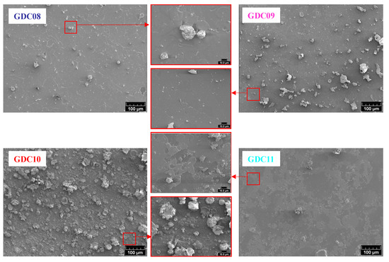 Top surface SEM micrographs of GDC coatings deposited on AISI 430 stainless steel substrates.