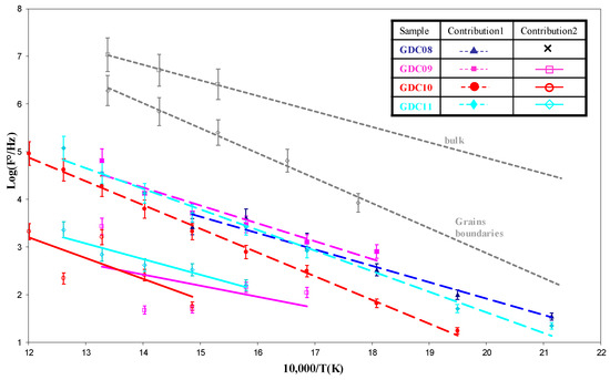 Electrical properties of the coatings were determined by impedance spectroscopy. On the Nyquist diagram presented in Figure 5, three domains can be distinguished, which correspond to the tendency for the samples GDC09, GDC10, and GDC11, whereas only two domains were detected for GDC08. In all cases, the signal for the high and middle frequency domains did not depend on the a.c. signal, in contrast to the low frequency range. This allowed for the discrimination of the layer response from that of the electrode as it is well known that the electrode response depends on the amplitude of the a.c. signal [33]. According to Suzuki et al. [39], the behavior of GDC08 is in accordance with that of thin layers or nanostructured materials. The other coatings presented a similar behavior as that of the bulk solid electrolytes [40], with two contributions for the electrolyte response. The relaxation frequency is a parameter that does not depend on the geometric factor [41]. The electrolyte in GDC was modeled with two R//CPE circuits in series (Bulk and grain boundaries contribution); the values of the fit results are reported in Table 3 for each sample as a function of the temperature.