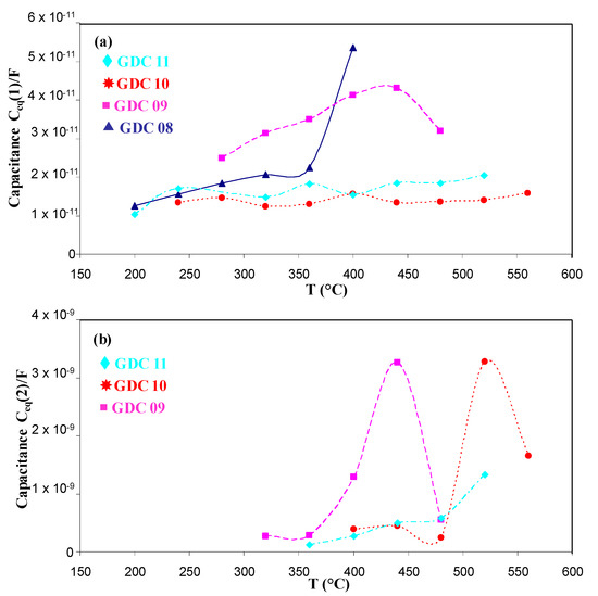In Figure 6, we compare the relaxation frequencies of the arc evaporated GDC coatings to those measured on a bulk 3.6 mm thick GDC whose signature for bulk and grain boundary responses was more pronounced [33]. For arc evaporated coatings, the first contribution was slightly higher than the second one, but all values remained lower than those obtained with the pellet, which could be due to the smaller grain size of the coating. Another electrical parameter can be used to estimate if both contributions correspond to the bulk and the grain boundary responses: the equivalent capacitance. The equivalent capacitances as a function of the temperature for the different coatings of this study were quite constant (Figure 7). The first and second contributions were around 10−11 and 10−9 F, respectively. According to Bauerle [40] and Tschöpe et al. [41], impedance spectroscopy measurements performed on cathodic arc evaporated coatings are quite similar to those performed on bulk ceramic sintered pellets, with two contributions for the electrolyte (i.e., 10−12 and 10−9 F for the bulk and the grain boundary contributions 1 and 2, respectively).