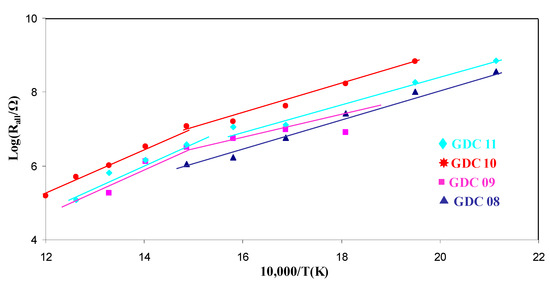 Arrhenius plots of the total resistance as a function of temperature for all GDC films.