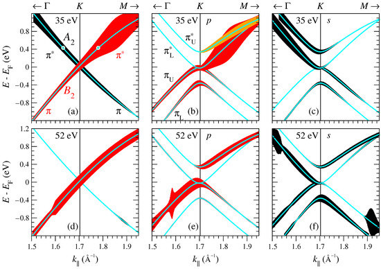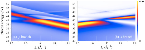 Calculated polarization dependence of the photoemission from the monolayer and bilayer graphene is shown in Figure 2 for along around the DP for two photon energies and 52 eV. The light incidence plane intersects the surface in the line, and the angle of incidence is 18°, as in the experiment of Ref. [18]. For the monolayer graphene, the two branches have different parities under the reflection in so the ascending branch ( symmetry) is visible only in p polarization and the descending branch () only in the s polarization. A similar trend is observed in the graphene bilayer, only here the states are not parity eigenfunctions, so every state is visible in both polarizations, albeit with a striking intensity asymmetry. The absolute intensities and the asymmetry, however, depend on the photon energy, as seen from the comparison of Figure 2a–c,d–f.