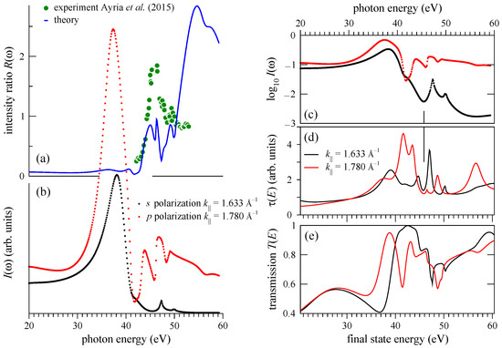 (a) Photon energy dependence of the relative intensity , see Equation (4), of the emission from the state () at Å and state () at Å for the polarization angle (4.3% of p and 95.7% of s polarization). Both initial states are located at about 0.4 eV above the DP. Full circles show the measurements of Ref. [18] (digitized from Figure 5 in that work). (b) Calculated constant initial state spectra (black) and (red). (c) Logarithmized intensities (black) and (red). (d) Dwell time : The probability to find the electron in the LEED state within a layer between and 2 a.u., see Figure 1. The final state energy E is relative to the DP. (e) Electron transmission for Å (black) and Å (red). To facilitate the comparison, the E range in graphs (d) and (e) is shifted by 0.4 eV (initial state energy) relative to the range in graph (c).