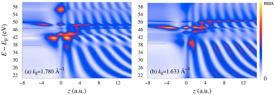 These results thereby establish the peak to originate from the rapidly changing character of the final state wave function, and it is tempting to relate it to gross features of the scattered wave. In particular, because the initial states are confined to the graphene layer it is instructive to consider the spatial character of the LEED states as a function of energy, see Figure 5. The electron scattering by the graphene monolayer was first studied theoretically in Ref. [5], where the existence of scattering resonances was predicted that manifested themselves as rapid variations of the transmission probability accompanied by a sharp enhancement of the density at the graphene layer. Figure 5 shows that around the point the resonances have rather complicated spatial structure, which strongly changes with . Consequently, the probability to find the scattered electron at the graphene layer—the so-called dwell time —varies with energy. The curves for and 1.780 Å are shown in Figure 4d (the probability density was integrated from to 2 a.u.). Both curves show rich structure, but the variations do not correlate with those of the photocurrent, and although the dip in the curve coincides with a minimum in the curve, the former drops much deeper than the latter. Generally, the variations are much weaker than the variations of the photocurrent, which points to the importance of the interference between different contributions to the photoemission matrix element also for p polarization.