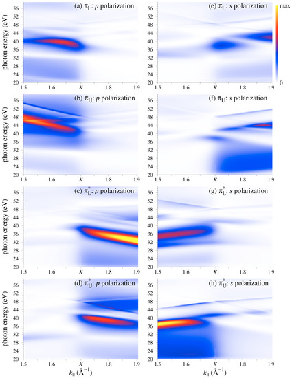 - Gierz, I.; Henk, J.; Höchst, H.; Ast, C.R.; Kern, K. Illuminating the dark corridor in graphene: Polarization dependence of angle-resolved photoemission spectroscopy on graphene. Phys. Rev. B 2011, 83, 121408. [Google Scholar] [CrossRef]