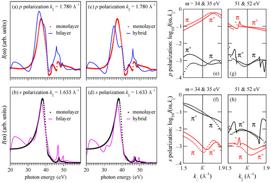 (a,b) Comparison of the CIS spectra for the monolayer (dots) and bilayer graphene (lines): (a) p polarization, (b) s polarization. The bilayer curves are a sum of the and spectra, see Figure 2b for notation. (c,d) Comparison of the monolayer (dots) and hybrid-model (lines) CIS spectra: (c) p polarization, (d) s polarization. The monolayer curves in graphs (a,c) and (b,d) are the same as the curves of the respective colors in Figure 4b. (e,f,g,h) Contrast between the and branches by the hybrid model. Crystal-momentum dependence of the intensity from the and states of the (red) and (black) branch for four photon energies: (e,f) eV (lines) and 35 eV (dots); (g,h) eV (lines) and 52 eV (dots) for p polarization (e,g) and s polarization (f,h).