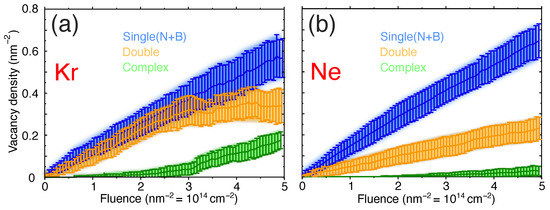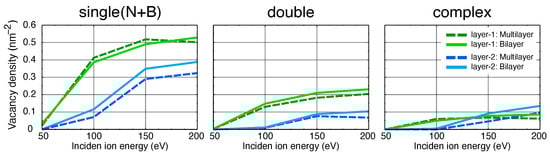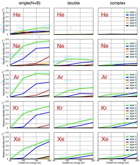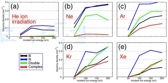 - Stephani, K.A.; Boyd, I.D. Molecular dynamics modeling of defect formation in many-layer hexagonal boron nitride. Nucl. Instrum. Methods Phys. Res. Sect. B Beam Interact. Mater. Atoms 2015, 365, 235–239. [Google Scholar] [CrossRef]