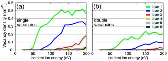 - Lehtinen, O.; Kotakoski, J.; Krasheninnikov, A.V.; Tolvanen, A.; Nordlund, K.; Keinonen, J. Effects of ion bombardment on a two-dimensional target: Atomistic simulations of graphene irradiation. Phys. Rev. B 2010, 81, 153401. [Google Scholar] [CrossRef]