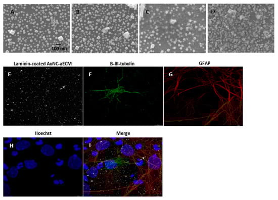 Characterization of AuNC-aECMs and laminin-coated AuNC-aECMs. (A–D) Scanning electron microscopy of AuNC-aECMs. The quantity of AuNCs can be controlled by reaction buffer solution and the concentration of AuNC colloidal solution (A: 12.8 fmol, 32 AuNCs/μm2 and B: 25.6 fmol, 54 AuNCs/μm2). The AuNC-aECMs were coated with laminin (C: 32 AuNCs/μm2 and D: 54 AuNCs/μm2). The cells growing on laminin-coated AuNC-aECMs (32 AuNCs/μm2) were analyzed with immunostaining assay and fluorescent images were obtained using Leica—Lightning Light Laser Confocal Microscope SP8X (E–I). (E) Laminin-coated AuNC-aECM, (F) β-III-tubulin immunostaining (neuron marker), (G) Glial fibrillary acidic protein (GFAP) immunostaining (astrocyte marker), (H) Hoechst staining, (I) Merged image.