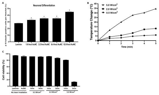 In attempting to further enhance neuronal differentiation, we hypothesized that laser-induced thermal stimulation of laminin-coated AuNC-aECMs might induce NSC plasma membrane heat stress that subsequently influences the differentiation of NSCs into neurons. To determine the laser-induced thermal dose delivered to laminin-coated AuNC-aECMs, post laser irradiation, the temperature of the surrounding medium of laminin-coated AuNC-aECMs (12.8 fmol; 32 AuNCs/μm2) was measured (Figure 2B). The results showed that laminin-coated AuNC-aECMs increased the temperature of surrounding medium in both a laser intensity-dependent and laser exposure duration-dependent manner. In our recent report [], we observed AuNCs onto the surfaces did not show significant morphological changes post laser irradiation. However, it should be remembered that any changes in nanoparticle composition, size, and shape will affect the light-to-heat conversion ability of nanoparticles, which would have a profound impact on photothermal responses of nanoparticles upon repeated laser exposures []. To characterize the absorption and scattering contribution of nanoparticles, employing new approaches described for diffuse-reflectance UV/vis/NIR spectroscopy could be a potent analytical technique []. To determine the appropriate parameters of laser irradiation that did not alter cell viability, we performed the cell viability assay using flow cytometry (Figure 2C). Following laser irradiation with varying laser intensity-duration combinations (0.5–5.0 W/cm2 for 1–5 min), cellular toxicities were not observed up to 2.0 W/cm2 for 1 min. Cell viability decreased slightly at 2.0 W/cm2 for 5 min (87.2% ± 0.6) and 5.0 W/cm2 for 1 min (81.1% ± 0.1) compared to the absence of laser irradiation (95.1% ± 0.3). The highest laser exposure of 5.0 W/cm2 for 5 min induced significant rNSCs cytotoxicity (13.6% ± 0.4).