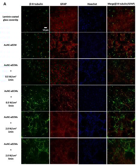 Neuronal differentiation of rNSCs grown on laminin-coated glass coverslips and AuNC-aECMs with/without laser irradiation. rNSCs were seeded onto both laminin-coated glass coverslips and laminin-coated AuNC-aECMs and after 2 days, cells were treated with indicated laser irradiation parameters (0.5–5.0 W/cm2 for 1–5 min). After 14 days, cells were analyzed with immunostaining assay (A,B). Differentiated neuron and astrocyte cell populations were identified with β-III-tubulin (neuron marker) and GFAP (astrocyte marker). Values represent the means ± SDs of three independent experiments. # p values < 0.05 vs. the control group (laminin-coated glass coverslip). * p < 0.05 vs. laminin-coated AuNC-aECM in the absence of laser irradiation group.