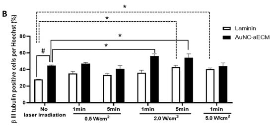 Figure 3B shows that laminin-coated AuNC-aECMs without laser irradiation increased neuronal differentiation markedly (44.6% ± 0.7) compared to laminin-coated coverslips (27.9% ± 0.3). In laminin-coated AuNC-aECMs with laser irradiation, we found no significant differences in neuronal differentiation except for 2.0 W/cm2 for 1 min (56% ± 2.9) and 2.0 W/cm2 for 5 min (54.1% ± 4.7) compared to laminin-coated AuNC-aECMs cultures in the absence of laser irradiation (44.6% ± 0.7). However, slightly increased neuronal differentiation was found in 0.5 W/cm2 for 1 min (47.2% ± 0.9) and 0.5 W/cm2 for 5 min (46% ± 2.4) compared to the absence of laser irradiation. On laminin-coated glass coverslips, we found significantly increased neuronal differentiation following laser exposure of 2.0 W/cm2 for 5 min (42.7% ± 1.8) and 5.0 W/cm2 for 1 min (40.6% ± 0.9) compared to laminin-coated glass coverslips without laser irradiation (27.9% ± 0.3). These results showed that laser irradiation alone increased neuronal differentiation regardless of the presence of AuNCs, although laser-induced thermal dose produced by laminin-coated AuNC-aECMs had a greater impact on neuronal differentiation.
