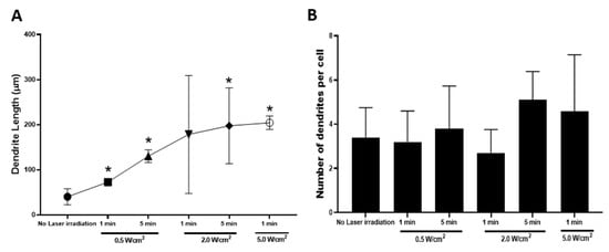 Assessment of the number and length of dendrites in differentiated neurons. rNSCs were seeded onto laminin-coated AuNC-aECMs, and after 2 days, cells were treated with indicated laser irradiation parameters (0.5–5.0 W/cm2 for 1–5 min). After 14 days, cells were analyzed with immunocytochemistry. The immunostaining images were analyzed with a custom-made MATLAB script to quantify the length and number of neuronal dendrites (A,B). Values represent the means ± SDs of three independent experiments. * p < 0.05 vs. laminin-coated AuNC-aECM in the absence of laser irradiation group.