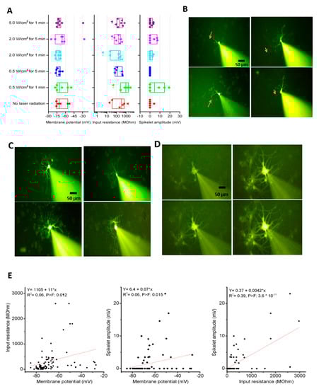 Assessment of neuronal electrophysiological activity in differentiated neurons. rNSCs were seeded onto laminin-coated AuNC-aECMs, and after 2 days, cells were treated with indicated laser irradiation parameters (0.5–5.0 W/cm2 for 1–5 min). After 14–16 days, cells were analyzed with the patch-clamp recordings (A–G). The resting membrane, input resistance, and spike amplitude were plotted for each coverslip (A). Cells that were filled with the Lucifer Yellow dye indicated morphological features post the patch-clamp recordings (B–D). (B) showed cells having a simple morphological structure with one identifiable fine axon (red arrow). (C) showed single cells having extensive dendrites in all direction. (D) showed that cells were connected to adjacent cells and a time-dependent filling of the neighboring cell. Correlation between electrophysiological parameters and representative electrophysiological data (E). A linear regression fit was performed among the different electrophysiological parameters: membrane potential, input resistance and spikelet amplitude. Note that a value of zero for the spikelet amplitude indicates that no spikelet could be evoked by member depolarization using positive current injection. (F and G) are representative voltage traces from an excitable cell (F) and a non-excitable cell (G) in response to injecting of square positive current pulses of varying amplitudes. Prob > F is a p-value for F-test, which is a probability with a value ranging from 0 to 1.