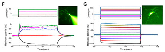 In Figure 5E, we found a significant correlation among three electrophysiological parameters. In particular, we found that when the input resistance is relatively high (indicative of a smaller cell), there is a higher chance of detecting a spikelet (i.e., amplitude > zero mV). In addition, the results showed voltage traces from an excitable cell (Figure 5F) and a non-excitable cell (Figure 5G) in response to injecting square positive current pulses of varying amplitudes. Note that the excitable cell (Figure 5F) has much higher input resistance (a smaller current produced larger membrane potential change) compared to the non-excitable cells (Figure 5G).