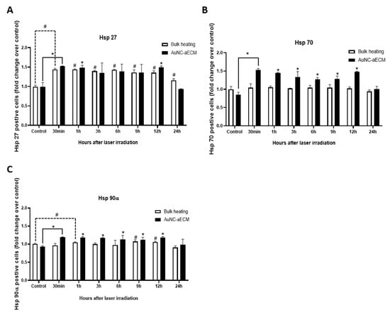 Assessment of heat shock protein 27, 70, and 90α expression in rNSCs. rNSCs were seeded onto laminin-coated AuNC-aECMs and after 4 days, the cells growing on laminin-coated AuNC-aECMs were treated with laser irradiation (2.0 W/cm2 for 1 min). The cells were collected at indicated time points and analyzed with flow cytometry to measure Hsp 27, 70, and 90α expression level (A–C). For bulk heating experiments, laminin-coated glass coverslips were placed into a 24-well plate, and rNSCs were seeded. After 4 days, plates were submerged in a circulating water bath at 43 °C for 30 min. The cells were collected with varying time points; then, the heat shock protein 27, 70, and 90α expression was measured by flow cytometry. Values represent the means ± SDs of three independent experiments. # p values < 0.05 vs. laminin-coated glass coverslip. * p < 0.05 vs. laminin-coated AuNC-aECM in the absence of laser irradiation group.