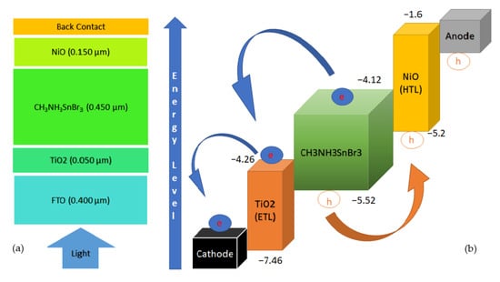 An undisputed revolution in the development of photovoltaic technology was achieved by solar cells based on metal halide perovskites with the formula of ABX3 (where A is an organic or inorganic cation, B is a lead or tin cation and X is a halide anion). Over the past few years, the power conversion efficiency (PCE) of perovskite solar cells (PVSCs) has increased rapidly from 3.9% to a certified 22.7% [1,2,3,4,5]. The remarkable increase in PCE is attributed to the supreme optoelectronic properties, such as high absorption coefficient (~105 cm−1), low exciton binding energy (~20 meV), and relatively long diffusion duration of the carrier (>1 μm) [6,7,8,9]. In addition, perovskite structure engineering from the simple methylammonium lead iodide (CH3NH3PbI3) perovskite to the new mixed-cation and mixed-anion halide perovskite materials also results in high efficiency [5,10,11,12]. Despite the rapid development, to achieve stability and meet the Shockley-Queisser Limit (SQL), which is ~30.5% PCE for a single Methylammonium Lead Iodide (MAPbI3)-based junction cell, the overall PCE of perovskite-based solar cells is still far away. Again, it is already reported that NiO-based inverted structure device can demonstrate superior stability than planner structure [13]. Therefore, it is particularly important, not only to minimize environmental toxicity by removing Pb in the perovskite composition, but also to achieve stability by compositional engineering without compromising photovoltaic efficiency to facilitate the commercialization of PVSCs [14,15,16]. The partial substitution or full replacement of Pb with comparatively less toxic tin (Sn) is an obvious choice among the many approaches investigated because of the similarity in their ionic radii (Sn2+: 0.93 Å vs. Pb2+: 1.20 Å) and electronic configurations that could theoretically retain the exceptional semiconducting properties of APbX3 [14]. In comparison to their pristine Pb-based counterparts, the synthesis of Sn-based perovskites promotes the recognition of lower band gap (Eg) perovskites [17,18,19,20]. Again, researchers found that the tuning of halide ions in the perovskite structure can lead to higher stability of the device. In this respect, several other attempts have been made to build efficient low Eg PVSCs based on Sn [10,12,14]. Nevertheless, there are still many problems that hinder the production of Sn-based PVSC with bromine (Br) as cation. In order to develop a non-toxic, highly efficient and stable PVSC, this article proposes a new absorber layer (Figure 1) of perovskite-CH3NH3SnBr3.