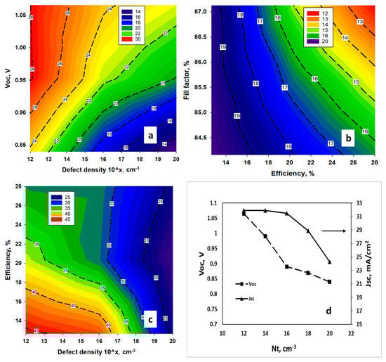 The impact of defect states in both the interfaces of Perovskite Solar Cell (PSC), TiO2/MASnBr3 and MASnBr3/NiO, have been studied in detail. At the ETL/Perovskite interface, density of defect states has varied from 1012 cm−3 to 1020 cm−3 where the position of the defect state was considered at the above of Ev with gaussian energetic distribution. It has been noted that Voc and efficiency decreases sharply (Figure 4a) from 0.99 V to 0.89 V, and 26.75% to 19.75%, respectively, when the density of the defect state in the interface reached 1014 cm−3. However, we did not find a notable observation for Jsc and FF, though both decreases (Figure 4b,c) with the increase of defect state density. Figure 4d expresses the correlation between Voc, Jsc and defect states in the ETL/Perovskite interface. It can be observed that increments in the level of defect state mainly impact the open circuit voltage rather than short circuit current. Therefore, a change in Voc is mainly attributable to the drop in the efficiency of the device. Hence, defect tolerance at TiO2/MASnBr3 can be figured up to 1014 cm−3 as beyond this level efficiency of CH3NH3SnBr3 solar cell deteriorates to a great extent.