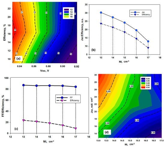 Effects of the variation of, (a) Efficiency and Voc, (b) Jsc and efficiency, and (c) FF and efficiency w.r.t. amphoteric defect density Nt, (d) relationship between Voc and Jsc w.r.t efficiency for different amphoteric defect states in CH3NH3SnBr3.