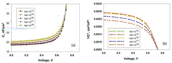 Mott-Schottky (MS) is a well-known and effective instrument used assessing the built-in potential (Vbi)- the difference between the functions of electrode operation [50] and the doping level of a device. MS theory is mainly based on the p-n junction properties [51], but it is also used in organic devices as well [52,53,54]. In the MS plot, slope of 1/C2 (V) interprets as a concentration of occupied trapping centers [53,54,55] and the x-axis intercept is usually representing the Vbi of organic semiconductor devices. Although the obtained values are lower than expected from the difference of the electrode work functions [56,57,58]. In reverse polarization, the capacitance of the system is the sum of the capacitance of the junction and the capacitance of the contact (for metal/TiO2 interface) [47,57]. The C-V characteristics and Mott-Schottky plot analysis of proposed solar cells were simulated in Figure 7a,b as a function of the TiO2 structure’s shallow uniform donor density (Nd). The concentration of donor density (Nd) varied in the range from 1014 1/cm3 to 1018 1/cm3 keeping other variables as constant. It has been observed (Figure 7a) that the capacitance increases gradually with the applied voltage and increased sharply at higher voltage and reached a maximum when Nd is 1018 1/cm3. From Figure 7a, it is clear that, at zero bias, this structure is fully depleted, but when the forward bias is applied, around 0.5 V, the depletion width shrinks to approximately equal to the thickness of the absorber layer. Therefore, capacitance increases with further increase in forward bias voltage, and behave according to Mott–Schottky relationship. It was already reported that the current is significantly lesser than the saturation current at low voltages, but the current was restricted to the saturation current at the contact at high voltages [59]. The lower value of the built-in potential (Vbi), obtained from the Mott-Schottky plot under illumination, can be ascribed to the capacitance originating from the photogenerated charge carriers that can build up in the low-mobility materials, even at reverse bias [60]. When doping concentration increases, charge accumulation increases at the interface and the capacitance value will also rise. Eventually the thickness of the depletion layer/space charge layer decreases, which eventually decrease the built-in potential (Vbi), according to the conventional capacitance equation: