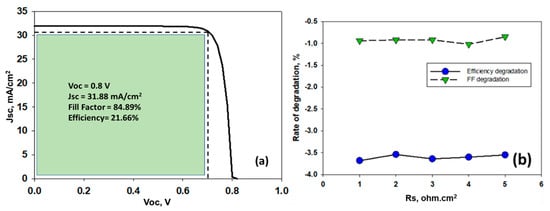 Non-ideality in a solar cell is an established reality now, which hinders the performance of the cell. There are several factors responsible for this, and one of them being parasitic resistances. Both series (Rs) and shunt resistances reduce the output of a solar cell. Figure 8 represents the equivalent circuit of a solar cell. Prior to analyzing the effects of series resistance, we have performed the simulation based on defect tolerances, optimized metal work function (MWF) and ideal Nd that has been investigated above. It is found that proposed device exhibits 21.66% efficiency with Voc = 0.80 V, Jsc = 31.88 mA/cm2 and FF = 84.89% (Figure 9a).