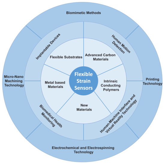 Therefore, in this review, the latest advances in flexible strain sensor over recent years from the material, application, and manufacturing strategies are summarized (Figure 1). Firstly, the critical parameters measuring the performances of flexible strain sensors and materials development contains different flexible substrates, new nano- and hybrid- materials are introduced. Then, the developed working mechanisms, theoretical analysis, and computational simulation are presented. Next, based on different material design, diverse applications including human motion detection and health monitoring, soft robotics and human-machine interface, implantable devices, and biomedical applications are highlighted. Finally, synthesis consideration of the massive production industry of flexible strain sensors in the future; different fabrication approaches that are fully expected are classified and discussed.