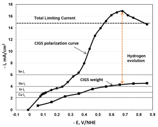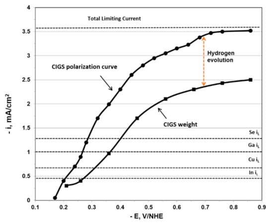 The partial currents data were combined to display the total CIGS deposition current density, based on the compositional analysis of the deposit, as displayed in Figure 4 and Figure 5. The difference between the measured total current density and the one based on the compositional deposit analysis is ascribed to hydrogen evolution. Also indicated in Figure 4 and Figure 5 are the theoretical limiting current densities iL determined using the Levich equation shown below []: