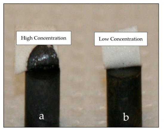 Peel tests were applied to the deposits from both systems (Figure 6). The peel test consisted of applying scotch tape to the deposit (disk with a radius of 0.32 cm) and peeling it rapidly. The deposit was considered to be of a good quality if it remained intact. Deposit fragments observed on the peeled tape were indicative of poor adhesion. Six of the seven samples electrodeposited from the low concentration system passed the peel test successfully, while all seven samples from the high concentration solutions failed the test (Figure 6). The peeled tape on the cylinder (a) (high concentration) shows a significant cylindrical black patch of peeled deposit, while the tape on the cylinder (b) (low concentration) is clear.