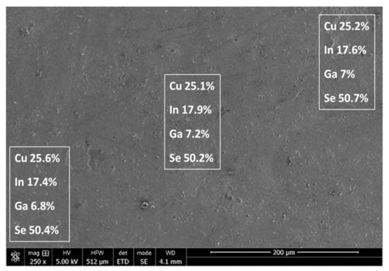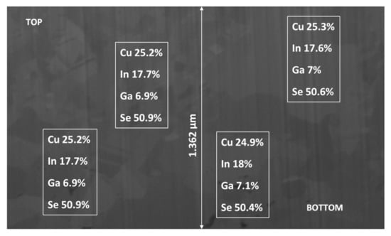 The analysis of the CIGS samples was obtained using FIB. In detail, the atomic composition information in the cross-section was determined by the FEI Helios NanoLab 650 Dual-Beam System equipped with a EDS. As shown in Figure 9, uniform atomic composition throughout the sample depth was obtained for the four components. Gallium again showed uniform composition prior to annealing, thus potentially enabling the reduction of the annealing time. It should also be noted that both gallium and indium exhibited uniform distribution across the sample, thus enabling an increase of the gallium atomic content in the deposit to 9% to increase the energy band.
