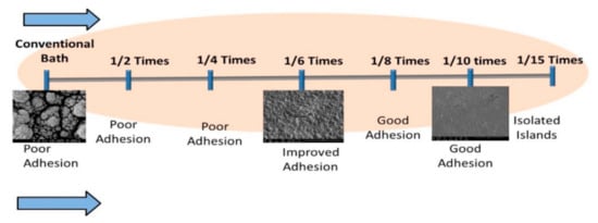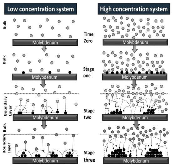 A model proposed by Scharifker and Hills [], providing a relationship between the nucleation density and the electrolyte concentration, was adapted to analyze the process and results of the present research. Figure 12 is a schematic representation of probable steps in the deposit nucleation process. The two panels provide a suggested comparison for the effect of the electrolyte concentration on the deposit morphology.