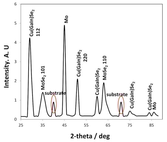 The deposited CIGS thin film was annealed at 500 °C for 30 min under argon atmosphere, and then subjected to XRD analysis to determine the crystallography of the absorber layer. The tested sample was 1.52 µm thick (KLA-Tencor P-6 Stylus Profilometer) (Milpitas, California, USA), and had a composition of 24.9% Cu, 17.3% In, 7.7% Ga, and 50.1% Se. The sample was electrodeposited at −0.76 V vs. NHE for 40 min, under ambient temperature (20 °C) on a stainless steel substrate disk rotated at 500 rpm. The electrolyte composition was 4.4 mM CuCl2·2H2O; 4.85 mM InCl3; 8.1 mM H2SeO3; 6.7 mM GaCl3; pHydrion (pH = 3); and 0.66 M LiCl as supporting electrolyte.