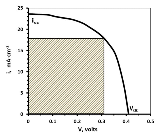 Furthermore, the connection device was designed in the lab in order to have a complete electric circuit to characterize the solar device. The characterized parameters were overall efficiency, quantum efficiency, open circuit voltage, short circuit current, dark current, band gap, and the fill factor. As a result, the equipment used was a PV Measurements QEX10 quantum efficiency (PV Measurements, Boulder, CO, USA) measurement system and an Oriel Sol2A solar simulator (Irvine, CA, USA). The solar simulator provides light and radiation similar to that provided from the Sun. The solar simulator tests the solar device efficiency and determines additional outcome parameters, including fill factor (FF), open circuit voltage (VOC), and the short circuit current (ISC). Fill factor is a parameter used to determine the maximum operating power point. It is given by: